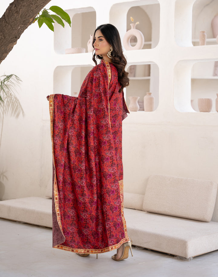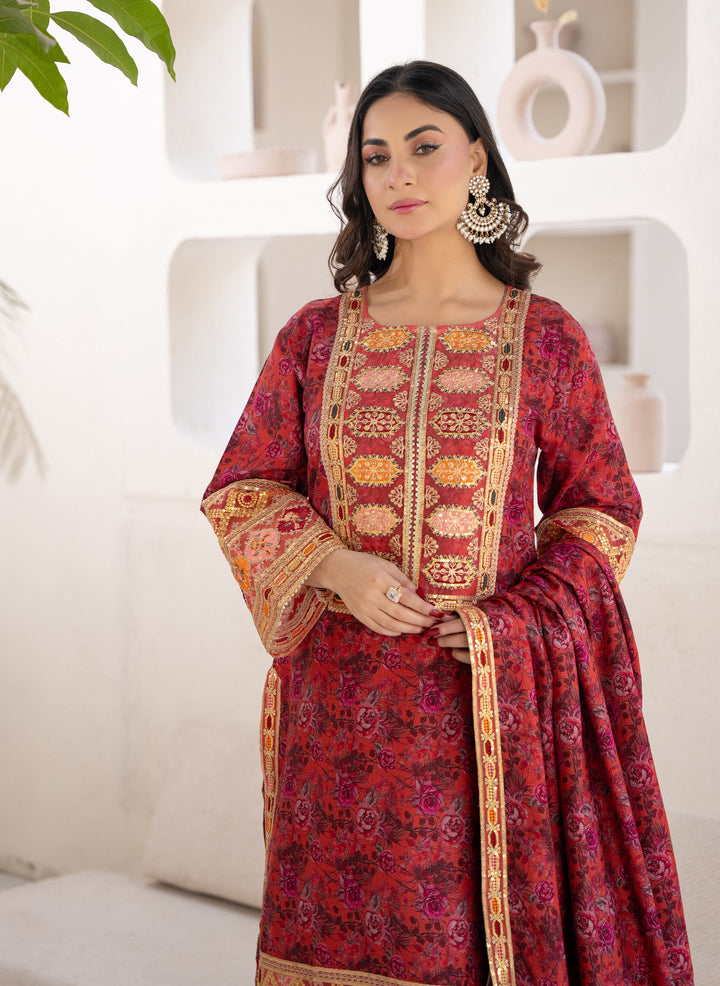 The shirt features a deep crimson base with an all-over floral print, elevated with a heavily embroidered ethnic-style neckline and luxurious border detailing that adds a royal touch. The matching printed dupatta flows beautifully, creating a statement look, while the straight printed trousers ensure comfort and perfect balance.